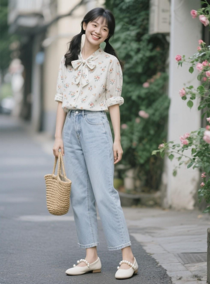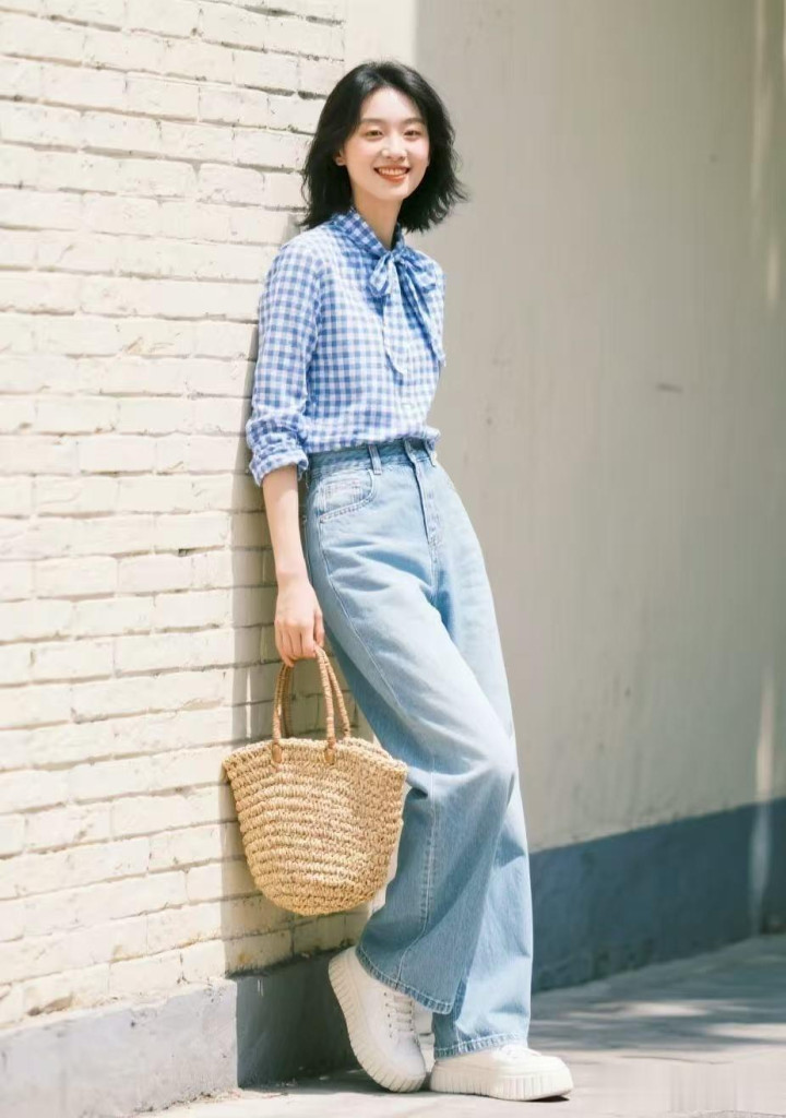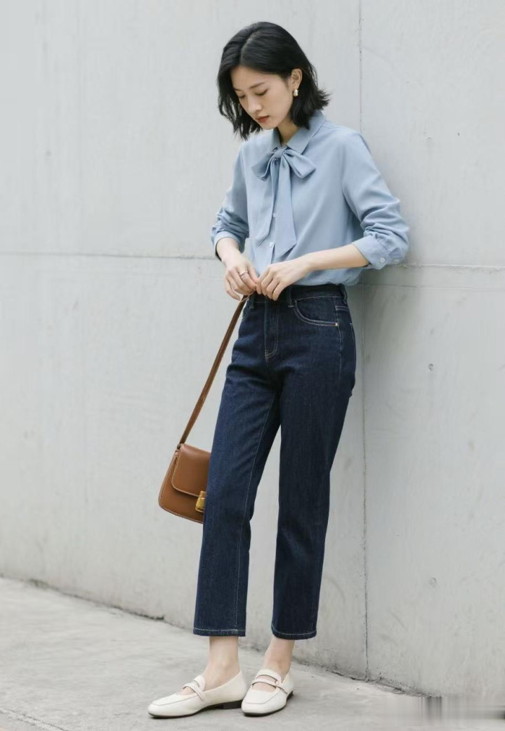 浅蓝衬衫与浅色牛仔裤的组合,像秋日湖面泛起的淡淡涟漪,清新而宁静。
