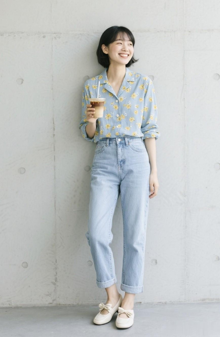 ❺印花衬衫 + 牛仔裤 + 低跟鞋:绽放于秋日的浪漫风情