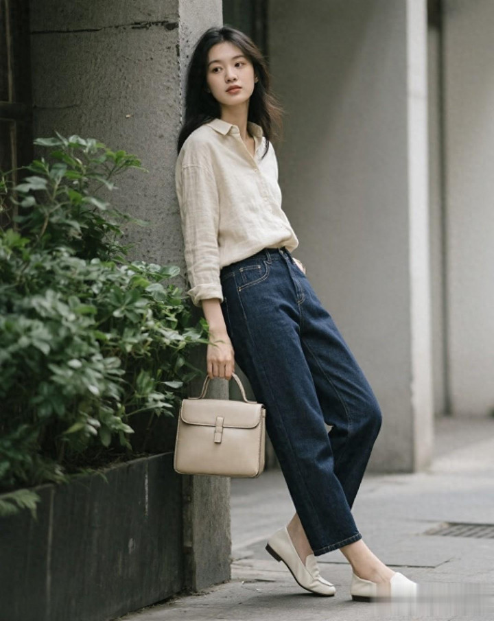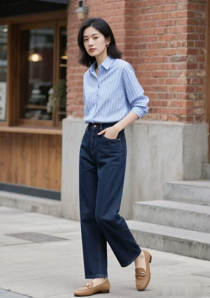 ❸浅蓝衬衫 + 牛仔裤 + 小单鞋:都市漫游者的温柔叙事